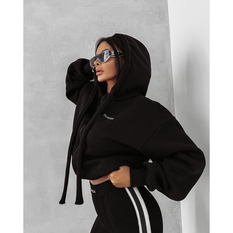 Casualowa, rozpinana bluza OLV, o krótszym kroju. Wykonana z miękkiej, przyjemnej w dotyku bawełny. Posiada oversize’owy krój z obniżoną linią ramion i szerokim ściągaczem w pasie. Z przodu subtelne logo marki OLAVOGA, a z tyłu duży napis „FEELINGS” (n.) THE MINDSET OF THE MOMENT. Obszerny kaptur i gruby sznurek.