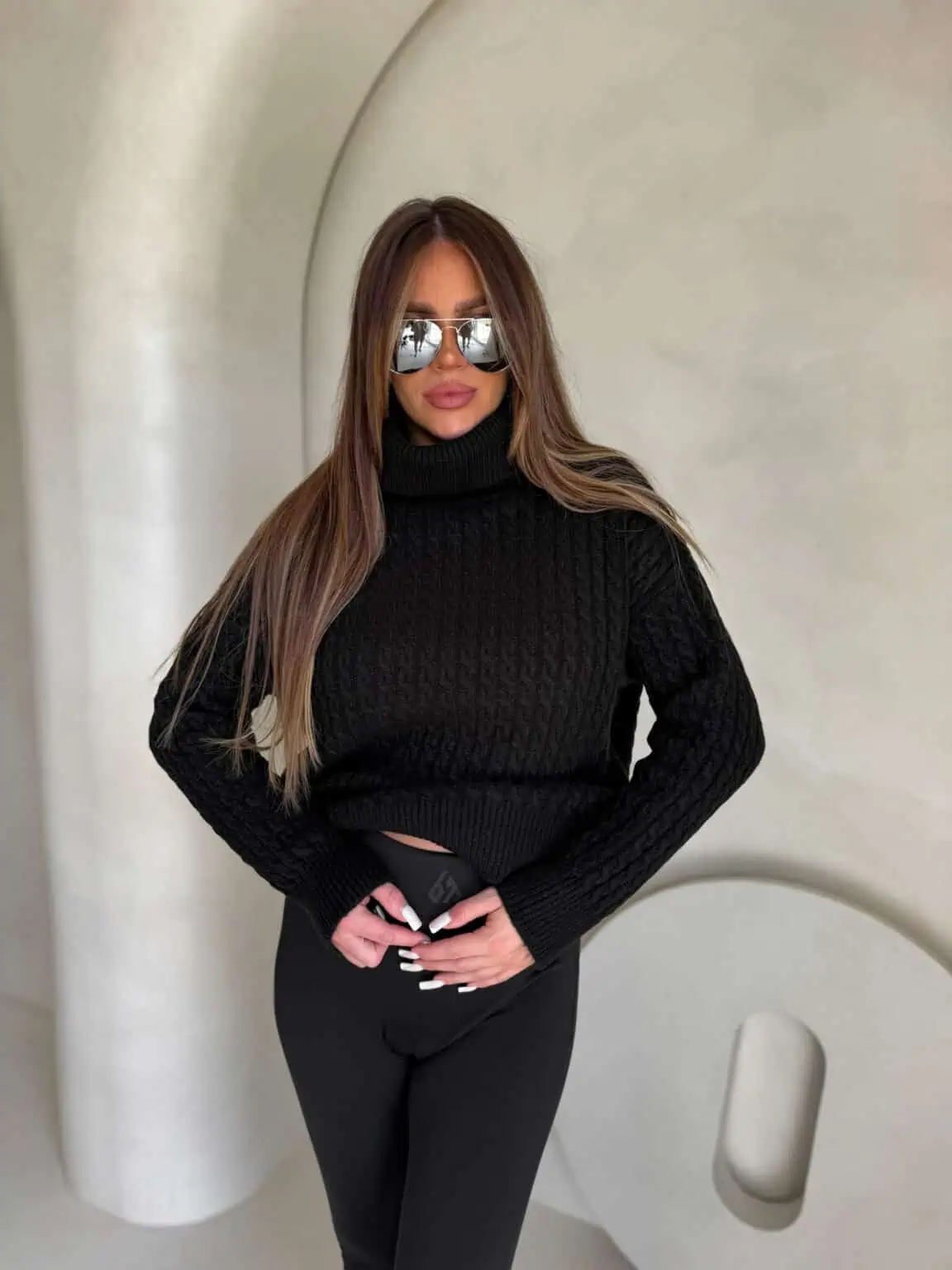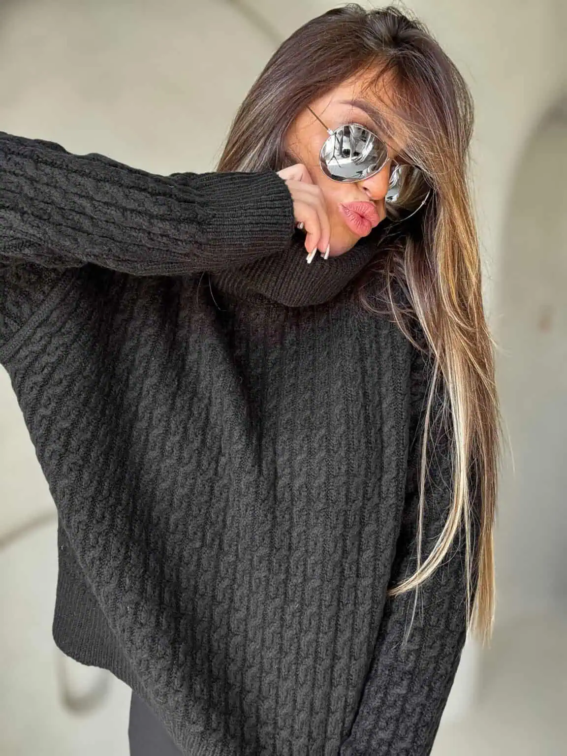 Sweter z golfem, wkładany przez głowę, na długi rękaw z ciekawym splotem. Bardzo ciepły.