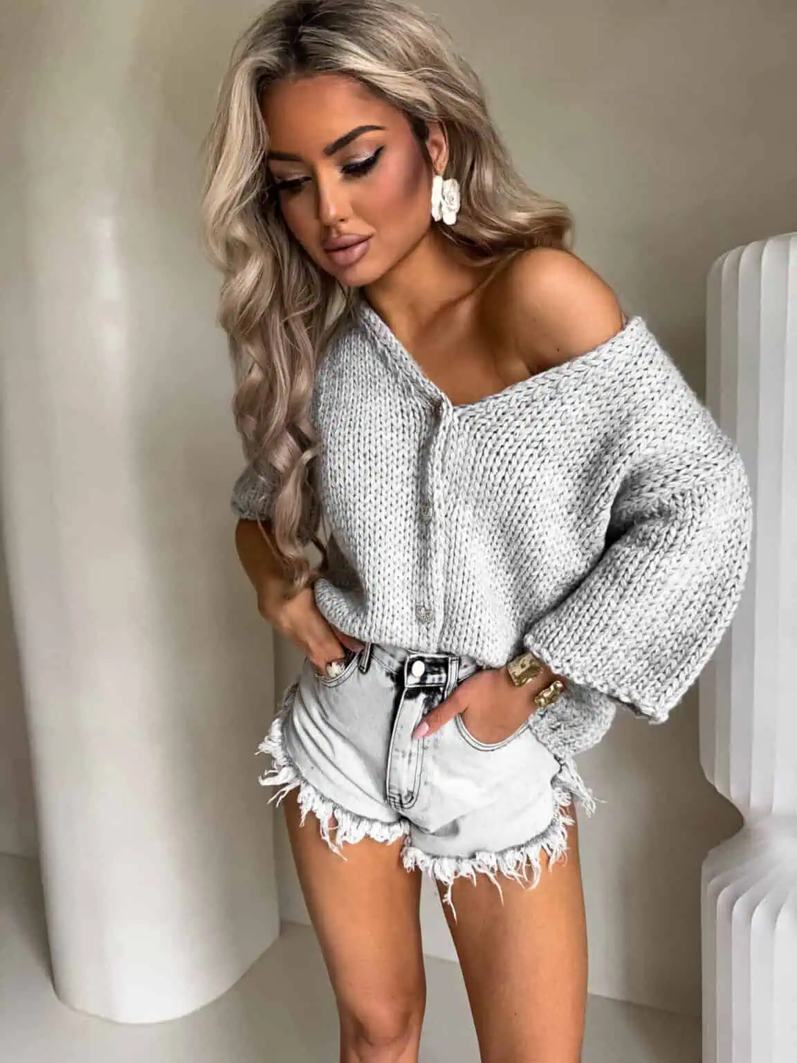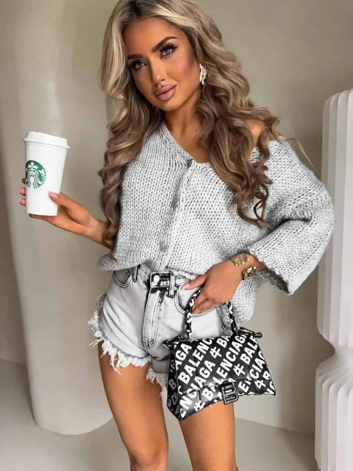 Przedstawiamy luźny kardigan o oversizowym kroju, wykonany z miękkiej, przyjemnej w dotyku dzianiny w stylu boho. Model z krótkim rękawem oraz dekoltem w kształcie litery V, który subtelnie podkreśla sylwetkę, a także kryje jej mankamenty. Kardigan zapinany jest na ozdobne guziki w kształcie serca, wysadzane na obrzeżach tworzywem imitujacym małe diamenciki.