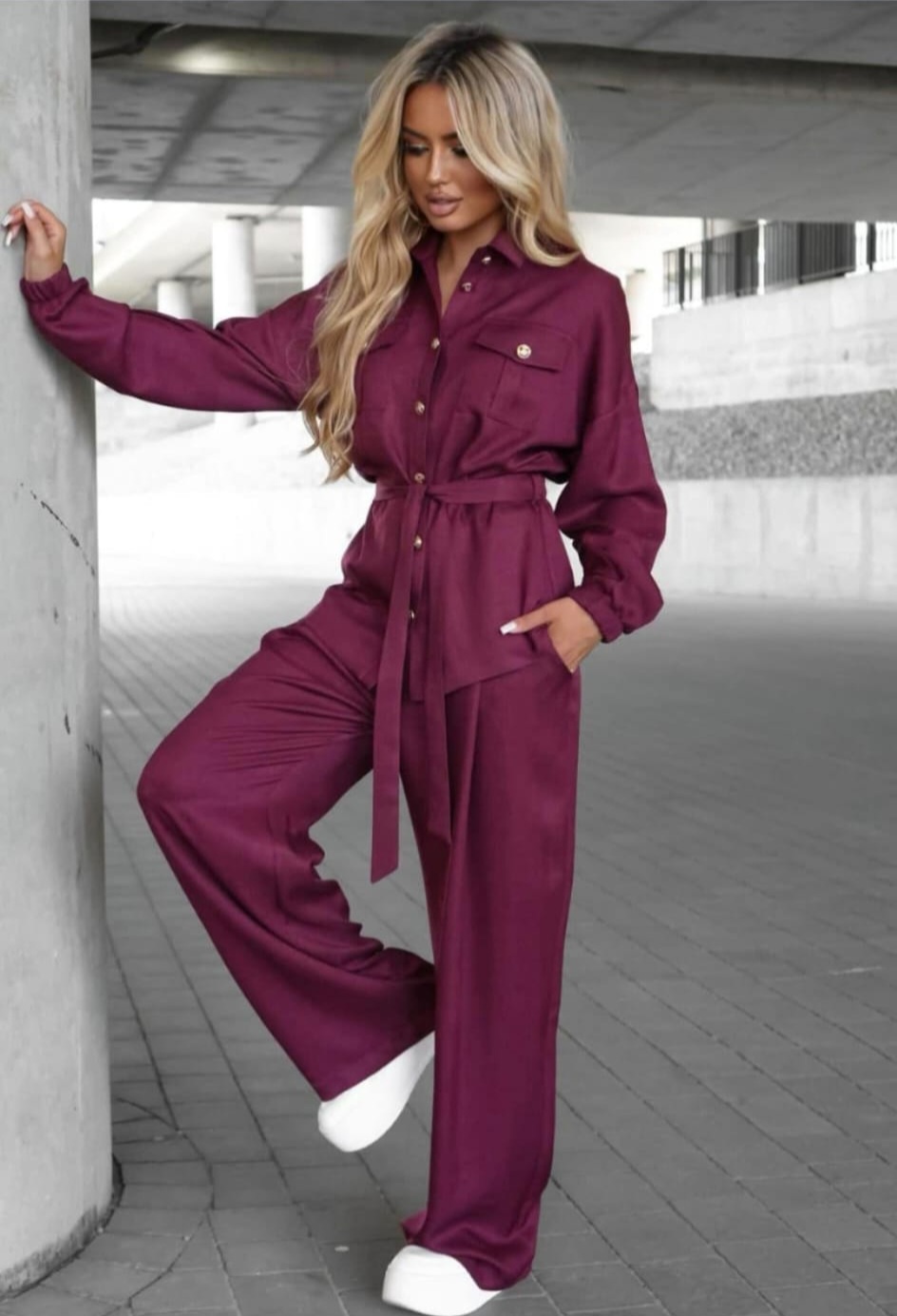 Komplet składający się z koszuli i spodni, to idealny zestaw na każdą okazję. Koszula ma zaokrąglony dół i zapinana jest na guziki. Posiada również praktyczną kieszeń na piersi oraz rękawy zakończone gumką, co dodaje jej wyjątkowego stylu. Natomiast spodnie wyróżniają się wysokim stanem i elastyczną gumką w pasie. Z przodu mają praktyczne kieszenie oraz zaszewki, które nadają im eleganckiego wykończenia.