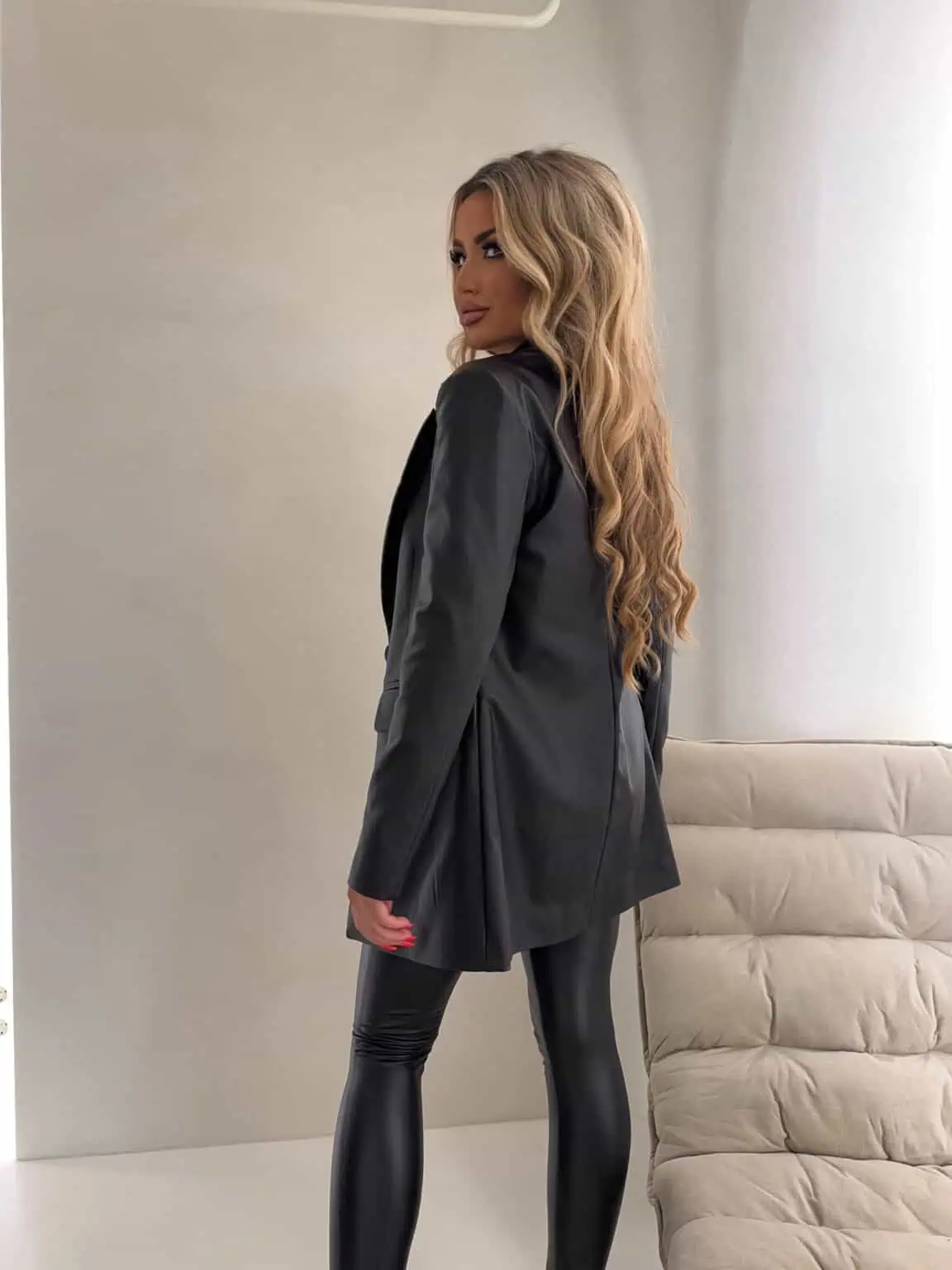 Marynarka o klasycznym, eleganckim fasonie. Jest delikatnie dopasowana w talii, dzięki czemu subtelnie podkreśla sylwetkę. Posiada jednorzędowe zapięcie na jeden guzik oraz klasyczne klapy o średniej szerokości. Po bokach znajdują się dwie kieszenie z patkami. Długość marynarki sięga poniżej bioder, co zapewnia eleganckie proporcje. Długie rękawy mają prosty krój.