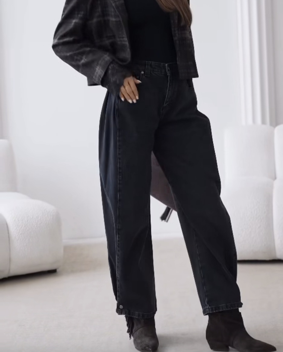 Spodnie by o la la o szerokim kroju. Poszerzane nogawki z obszytą wstawką z boku, wzdłuż nogi nadaje stylu. Guziczek do odpinania na dole dzięki któremu sami decydujemy jaki chcemy fason.