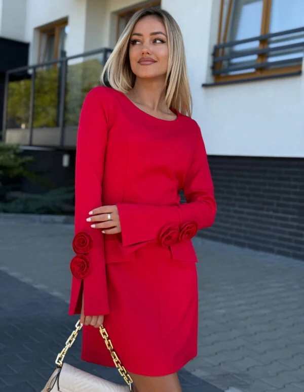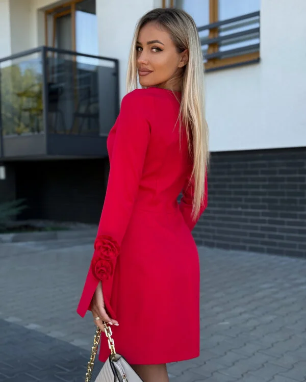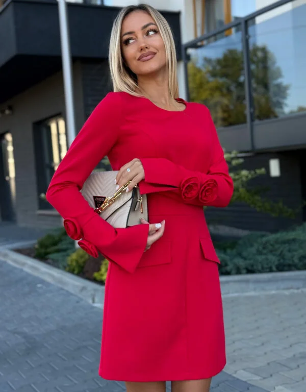 Elegancka sukienka z rękawem ozdobionym kwiatem w kolorze sukienki. Model taliowany, na plecach zapinana na kryty zamek.