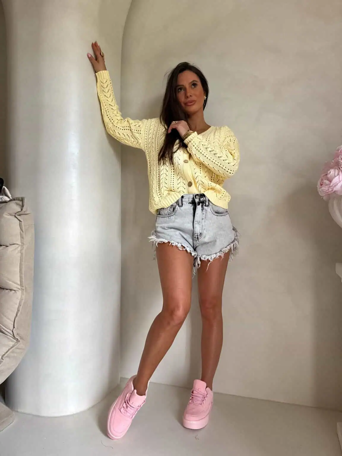 Rozpinany sweter Wood w kolorze pastelowej zółci to kwintesencja zbliżającej się wiosnuy z nutką nowoczesnego designu. Model ten pochodzi od znanej polskiej marki By Me. Kardigan ten wyróżnia się wyjątkową ażurową fakturą materiału, która swoim splotem nawiązuje do naturalnych struktur, nadając stylizacji niebanalnego charakteru. Ten rozpinany sweter został wykonany z miękkiej, wysokiej jakości dzianiny. Zapewni Ci ona komfort i ciepło, jednocześnie świetnie układając się na sylwetce dzięki fasonowi oversize. Model te ma krótszy krój oraz dekolt v-neck w serek. Kardigan zapinany jest z przodu na stylowe drewniane guziki. Jego długie rękawy zakończone są ściągaczami, podobnie jak dół swetra. To propozycja dla kobiet, które stawiają na jakość i szukają ubrań, które będą bazą dla wielu różnorodnych outfitów przez wiele sezonów.